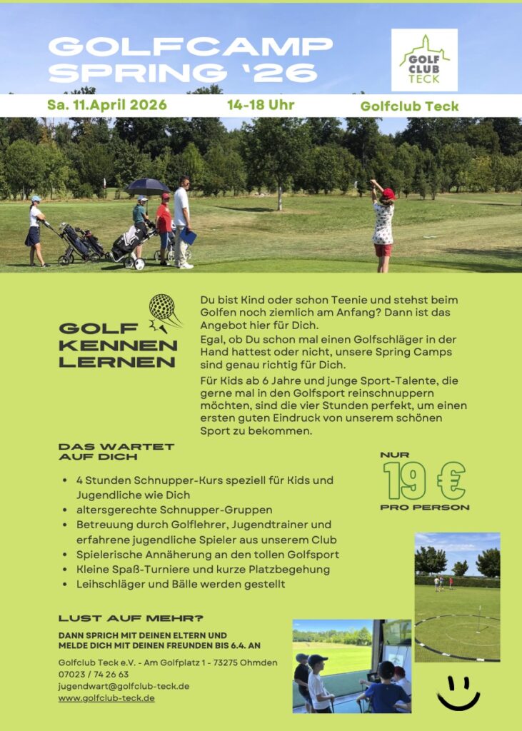 Am Samstag 11.4. am Ende der Osterferien veranstalten wir hier im Golfclub Teck e.V. wieder ein Schnupper-Spring-Camp für Kinder und Jugendliche Anfänger. Info-Seite zum Spring Camp 2026 am 11. April